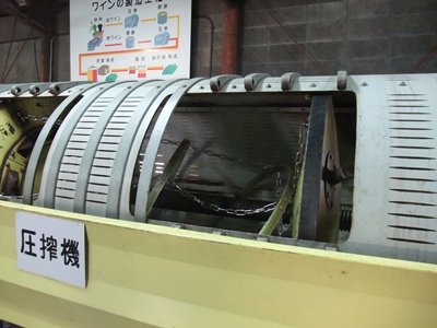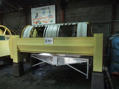 次に、破砕したブドウを絞る圧搾機。しぼってブドウ汁がでますよ〜