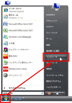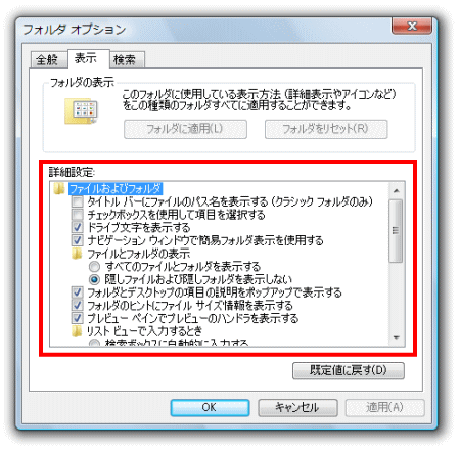 1.スタートボタンをクリックし、「コンピュータ」をクリックします。 ![]() (コンピュータの画面が表示されます。) ![]() 2.「整理」ボタンをクリックし、「フォルダと検索オプション」をクリックします。 ![]() (フォルダオプションの画面が表示されます。) ![]() 3.「表示」タブをクリックします。 ![]() 4.「詳細設定」の一覧から、下の4つの項目を探し、それぞれ設定します。 ![]()