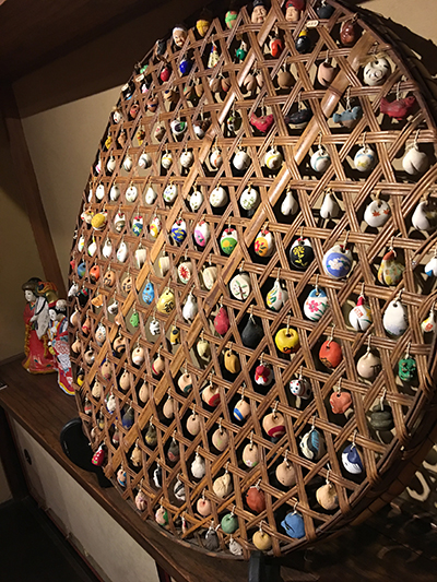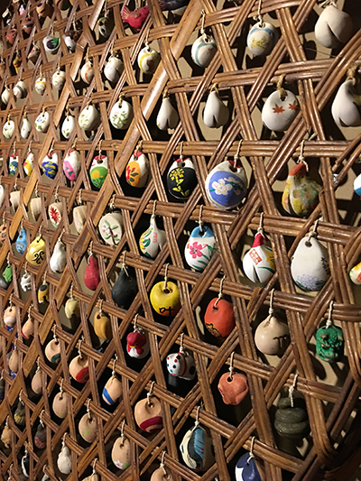 小さな土鈴が籠(ざる?)にたくさんつるされていて、とってもかわいかったです。