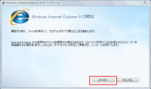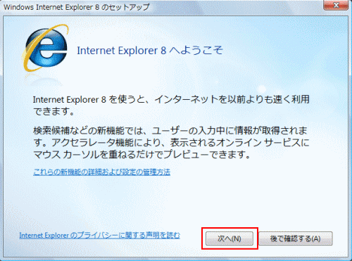 1.Internet Explorerを起動します。すると下のような画面が表示されるので、「次へ」ボタンをクリックします。