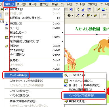 1.「イメージマップの編集」をする画像が入っている ファイルを開いておく。 2.「イメージマップの編集」をしたい画像をクリックし選択します。 3.「編集」をクリックし、「かんたん編集」をポイントし、 「イメージマップの編集」をクリックします。 (イメージマップエディタ の画面が表示されます) ※編集しやすいように画面をおおきくすることをお勧めします。 4.リンク部分を作るために、図形ボタンから1つクリックして 選択します。 5.リンク部分にしたい場所をドラックして囲みます。 6.ドラッグした後、すぐに「属性」の画面が表示されるので、 「参照」ボタンをクリックし、表示したいページを選択し、 「開く」ボタンをクリックします。 「属性」画面にもどり、「OK」ボタンをクリックします。 (イメージマップエディタ の画面が表示されます) この時に、リンク部分が囲まれています。 サイズや、位置の変更はこの時に行います。 全てのリンク設定が終わったら、「OK」ボタンをクリックします。 |