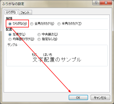 3.下のような画面が表示されるので、「種類」を「ひらがな」にし、
