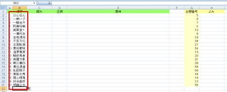 2.「練習表」シートの セルG2〜G21まで(薄い黄色の部分)に 1〜62 までの