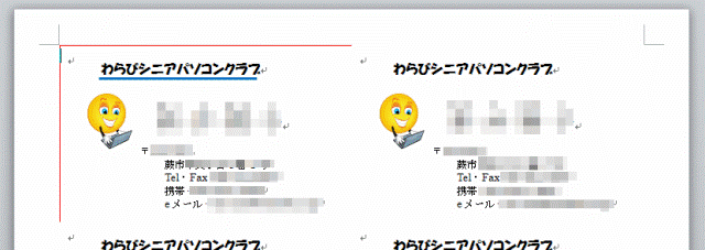 今、生徒さんと「Word」で名刺を作っています。1枚完成させ、コピー・貼り付けで10枚作り、最後に全体の「枠線」をなくしますが、お一人だけどうしても線が消せません。