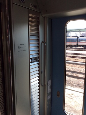 食堂車の入口は、こんな感じ。階段で上と下に分かれる感じ。