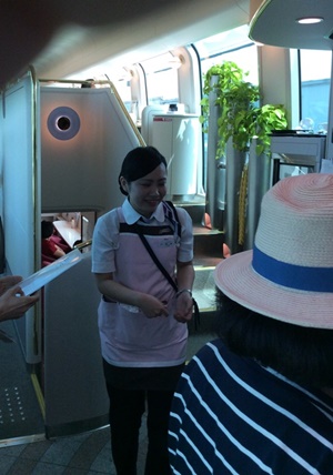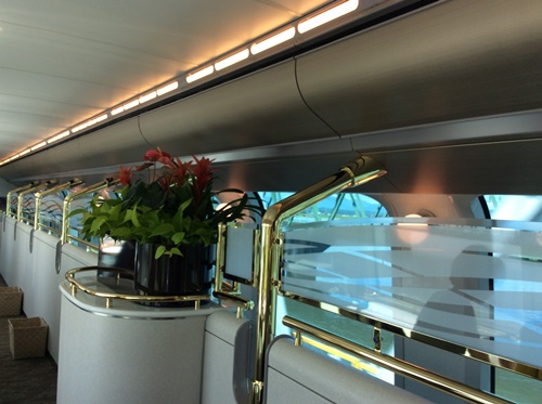 そして、食堂車に到着。上下に分かれているので、上の一番端の席に。