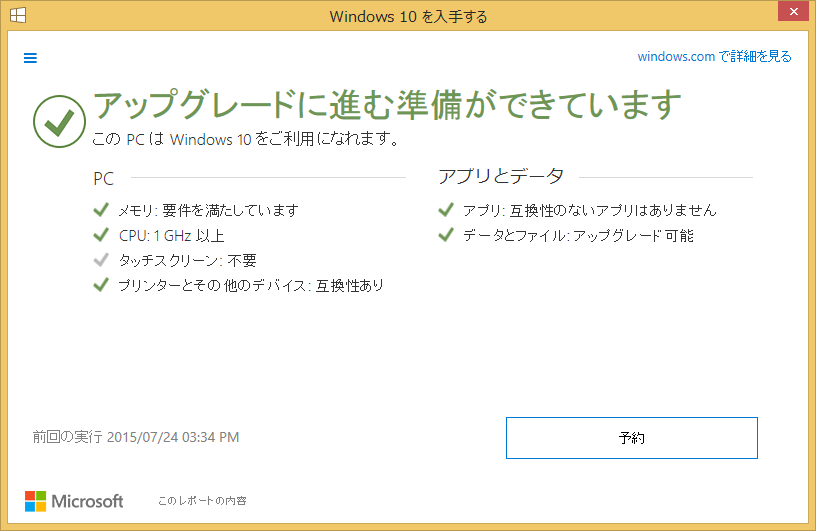 これが、”Get Windows10 アプリ”というもので、これを起動すると予約(もう出来ないかな?)または、お使いのパソコンがWindows10の仕様にあっているかの「PCチェック」が出来ます。