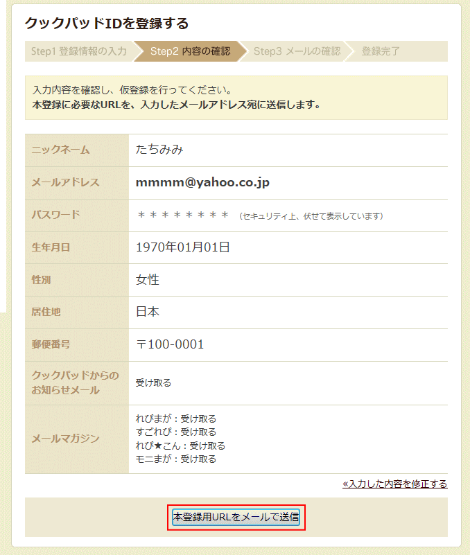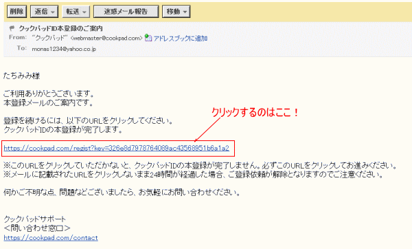 8.クックパットから「クックパッドID本登録のご案内」というメールが届いているので、中を見てみます。