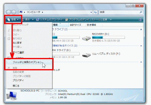1.スタートボタンをクリックし、「コンピュータ」をクリックします。 ![]() (コンピュータの画面が表示されます。) ![]() 2.「整理」ボタンをクリックし、「フォルダと検索オプション」をクリックします。 ![]() (フォルダオプションの画面が表示されます。) ![]() 3.「表示」タブをクリックします。 ![]() 4.「詳細設定」の一覧から、下の4つの項目を探し、それぞれ設定します。 ![]()