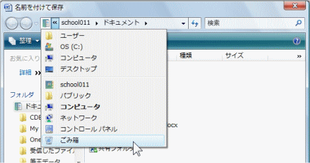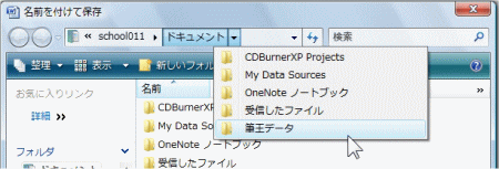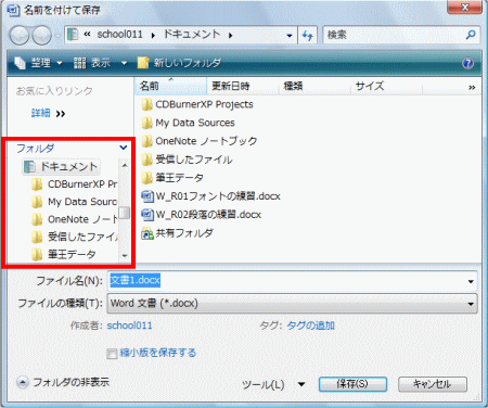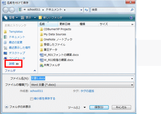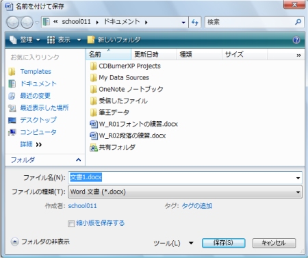 「名前を付けて保存」この操作は、バージョンが新しくなっても必ずある操作です。 しかし、Vistaになってから、「保存先」の表示がずいぶん変わりました。 2000、2002、2003であった、左側の「プレースバー」が消えました。 このバーは初心者の人にはとってもありがたく、便利だったのですよねー。 (※下は、すみません、Excel2003の名前を付けて保存の画面です。) (※下は、Word2007の名前を付けて保存の画面です。上と比較してみて下さいね。) ![]() さて、「保存先」を指定しようとして、今まで通り「保存先」の部分をクリックすると・・・ ![]() 「あらびっくり!」ホームページなどで見たことのあるアドレスに変わってしまいます。 ![]() こうなってしまうと、どうしていいかわからなくなってしまいます。 いや、わからなくはないのですが、わかりにくいですね。 そこで、この部分はどんな風に操作をするのが良いのかを、ちょっと解説。 注意!アドレスに一度でもなってしまうと、戻せないのですね。 いや、戻せますよ。「ESC」キーを2回くらい押してみてください。 ちゃんと元の状態になります。 いつもの部分には、「ドキュメント」と表示されている部分があります。 この右側の▼をクリックするのが正解! ![]() クリックすると、下の画面のようになります。 ![]() ドキュメントフォルダの中にあるフォルダの一覧が表示されます。 もし、ドキュメント以外の場所にしたい場合は・・・ 「ドキュメント」の左側の▼をクリックします。 ![]() クリックすると、下の画面のようになります。 ![]() ドキュメント以外の頻繁に使うフォルダの一覧が表示されます。 ここから、目的の場所をさがします。 しかし、コンピュータや、CD-ROMの部分が見えません。 さらに、最近良く使われている、リムーバブルディスクの場所とかは・・・ ユーザー名の左側の 《 をクリックすると・・・ ![]() はい、これで、コンピュータが見えてきました。 リムーバブルディスクや、CD-ROMは、コンピュータをクリックしてから、進んでみてください。 次に、名前を付けて保存の画面が少し小さい場合があります。 下の画面はその時の画面です。 ![]() この画面は、Word以外でも、メモ帳や、ペイントなど、他の時にもでます。 もちろん、先ほど説明した場所の部分から保存先を選択していってもいいのですが、 「フォルダの参照」を使った方がよりいっそう楽に保存先を選ぶことができます。 ![]() ここをクリックすると・・・ 下の「フォルダの参照」をクリックした場合の画面です。 ![]() この画面、先ほど見ましたね。そうです。左側にプレースフォルダ代わりの「フォルダの参照」が 表示されます。 これが表示されていれば、操作も楽に出来ると思います。 でも、この部分を操作するにも少しコツというか知っておかなければいけない部分があります。 注目するのは、「詳細」という部分です。 ![]() この部分をクリックすると「フォルダの参照」部分の表示が変更されます。 ![]() どんな風に変更されたかは、わかりにくいのですが、よくパソコンを使っている人からすると 「おー、これで、どの場所にも保存できる!」とわかるはずです。 「詳細」部分をクリックすると、パソコンのどの場所も参照できるようになります。 ですので、保存の時に、保存場所を頻繁に変更する方は、この「詳細」の表示を 常にしておくと便利でしょう。 「では、さっきの上の部分は?」 そうですね、その部分は、「お気に入り」という部分で、自分で何を表示させるかを選べます。 この部分については、「ユーザーフォルダについて」のところで説明したいと思います。 |