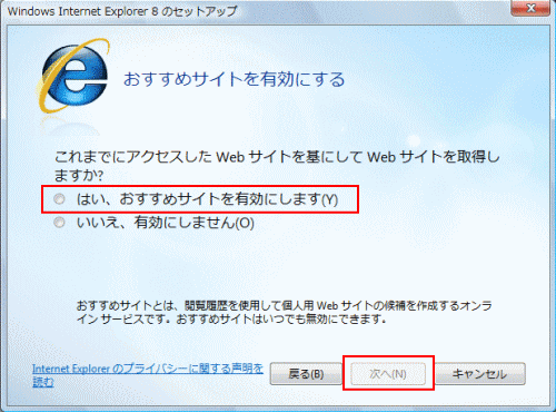 3.下のような画面が表示されるので「はい、おすすめサイトを有効にします」をクリックし、「次へ」ボタンをクリックします。