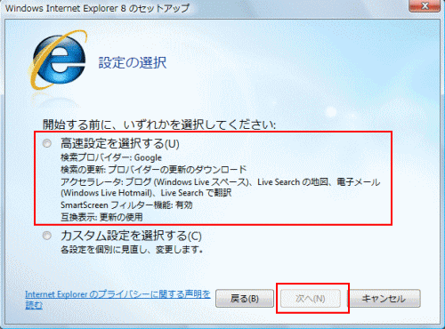 4.下のような画面が表示されるので「高速設定を選択する」をクリックし、「次へ」ボタンをクリックします。