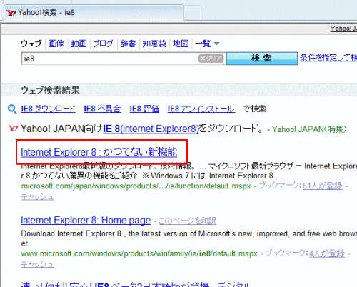 2.検索結果の上位に「Internet Explorer 8 : かつてない新機能」というのがあります。これをクリックします。
