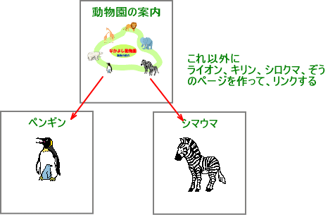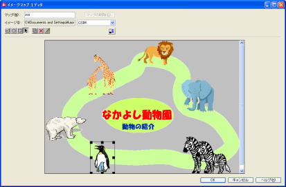地図や、部屋のレイアウト図など、1枚の画像のある部分をクリックすると、そこに関連する内容のページが表示される事があります。 これは、画像の各部分にリンクが設定されているからです。 ホームページビルダーでは、この設定を「イメージマップの編集」という機能で行うことができます。 ここでは、動物園の案内を目的としたページを「イメージマップの編集」で行ってみましょう。 作成前に、まずは、完成例を見てください。 完成例は・・・・・・・>>>こちらから ページの構成 ・動物園の案内・・・・・・・・・zoo.html(ここに中心の画像があります) ・ペンギンのページ・・・・・・・・penguin.html ・シマウマのページ・・・・・・・・simauma.html ・ライオンのページ・・・・・・・・lion.html ・ぞうのページ・・・・・・・・・・・zou.html ・キリンのページ・・・・・・・・・・kirin.html ・シロクマのページ・・・・・・・・sirokuma.html ![]() 事前に、各ページを作成しておきます。 この時に必要な画像類は、 ここ からダウンロードしてください。 (LZH形式に圧縮されています。解答して使ってください。) |