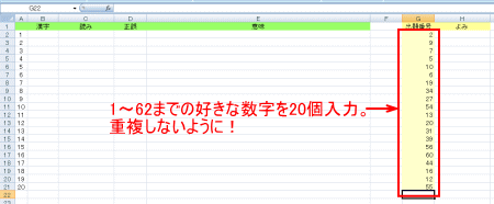 2.「練習表」シートの セルG2〜G21まで(薄い黄色の部分)に 1〜62 までの