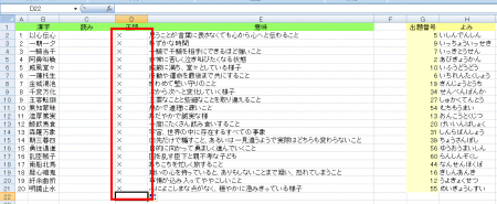 9.セルD2 にC列に入力された読みと、H列に表示された正しい読みがあっているかどうかの答え合わせの○×が表示されるようにします。