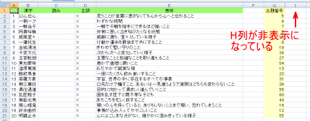 11.H列の読みが見えないように非表示にします。H列番号を右クリックし、「非表示」をクリックします。