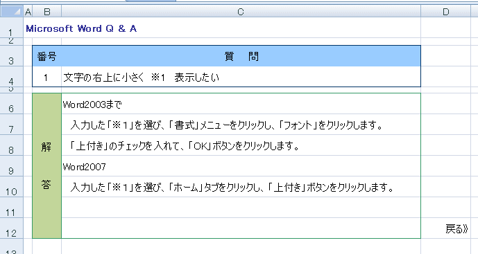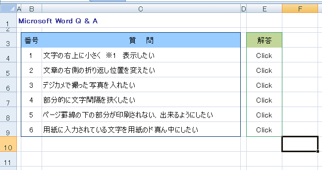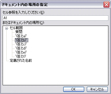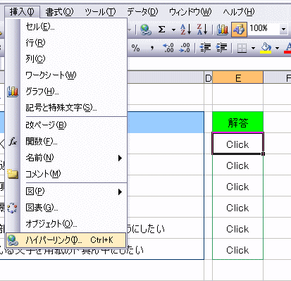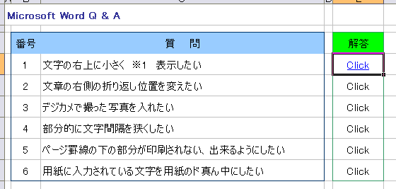 ホームページの作成には、必ず使われる「ハイパーリンク」。 この機能は、WordやExcelにもあり、使いかしだいで面白いものが作れます。 今回は、Excelのハイパーリンクを使って、Q&Aが書き込まれているファイルを作ってみましょう。 まずは、元となるサンプルが必要なのです。もちろん、自分で作っていただいてもOKです。 もし、作成されるようでしたら、下を参考に作ってみてください。 時間がない方は、サンプルをダウンロードして使いましょう! サンプルのダウンロード・・・・・・・・・・Word Q&Aはこちらから Excel Q&Aはこちらから Word Q&Aのサンプルの一部分をつくるならば、下を参考にしてください。 Sheet1には、下のような表を作成しましょう。(シート名は、「質問」と変更してください。) ![]() Sheet2には、下のような表を作成しましょう。(シート名は、「(答えb)」と変更してください。) ![]() もとのサンプルができたところで、ハイパーリンクの設定に入ります。 今回は、Excel2003で説明をします。 |