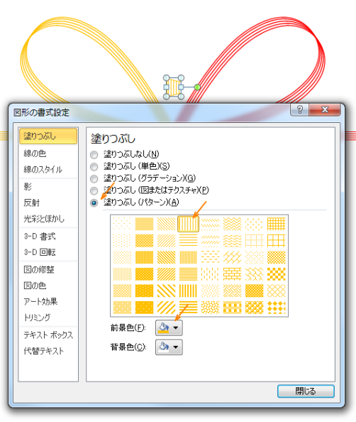 塗りつぶしは、「パターン」とし、「縦線」を選び、前景色と線の色をオレンジにします。