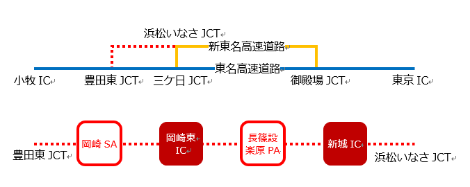 これが今回開通した「浜松いなさJCT」から「豊田東JCT」になります。
