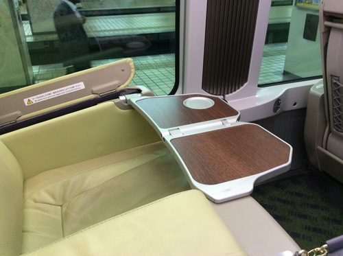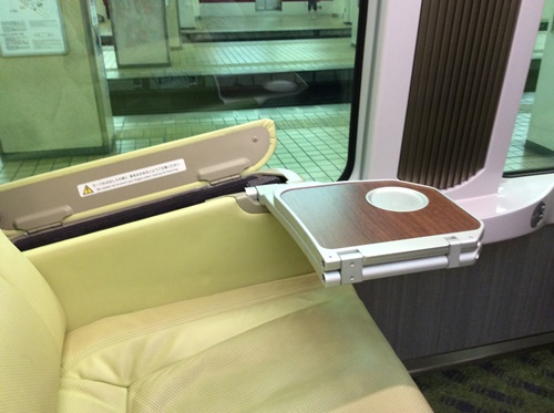 前の座席から出てくる机、これも何とも大きくて、手前に引くのは2段階あります。