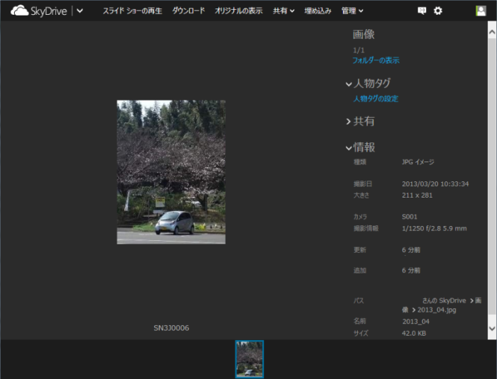 SkyDriveでは、写真の回転は出来ないので、向きをちゃんとしたい場合は事前に回転をし、それをアップロードして下さい。