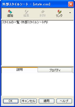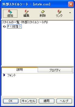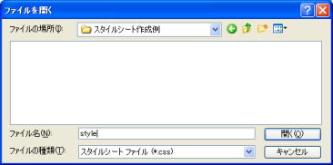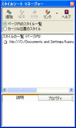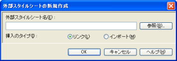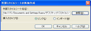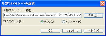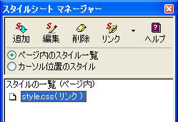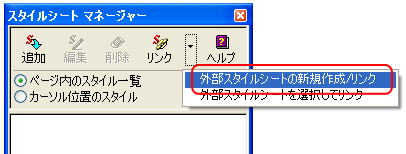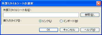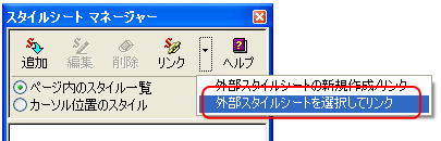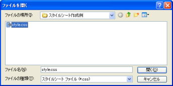 3.「リンク」ボタンの ▼をクリックし [外部スタイルシートの選択してリンク] をクリックします。 (外部スタイルシートの選択 が表示されます) 4.[参照]ボタンをクリックします。 5.[ファイルの場所]をスタイルファイルが保存されている場所にし、 スタイルのファイルをクリックします。 6.[開く]ボタンをクリックします。 (外部スタイルシートの選択 が表示されます) 7.[OK]ボタンをクリックします。 (スタイルシート マネージャー が表示されます) ページを保存することによって、下のように、 スタイルのファイル名が表示されます。 ![]() |
