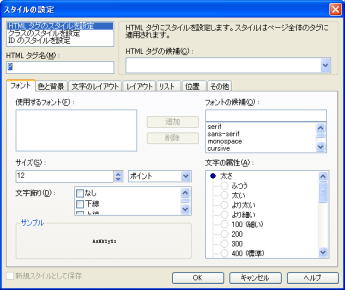 1.スタイルシートを設定したいファイルを開いておく。 2.メニューバーの 「表示」 → 「スタイルシート マネージャー」を選択します。 (スタイルシート マネージャー が表示されます) 3.「リンク」ボタンの ▼をクリックし [外部スタイルシートの新規作成/リンク] をクリックします。 (外部スタイルシートの新規作成 が表示されます) 4.[参照]ボタンをクリックします。 5.[ファイルの場所]をホームページが保存されている場所にし、 [ファイル名]には、 「 style 」 と入力します。 6.[開く]ボタンをクリックします。 (外部スタイルシートの新規作成 が表示されます) 7.[OK]ボタンをクリックします。 (外部スタイルシート の画面が表示されます) 8.[追加]ボタンをクリックします。 (スタイルの設定 の画面が表示されます) 9.スタイルの設定をします。 10.必要な設定が終わったら、「OK」をクリックします。 (外部スタイルシート の画面が表示されます) 11.更に追加で設定をする場合には、[追加]ボタンをクリックします。 設定が終わったら、[閉じる]ボタンをクリックします。 (スタイルシート マネージャー が表示されます) ページを保存することによって、下のように、 スタイルのファイル名が表示されます。 ![]() |