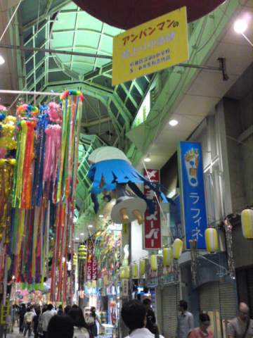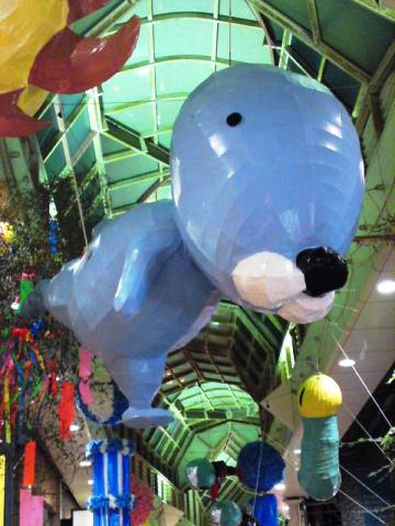 製作中は、商店街のアーケードの上に作品がつるされています。