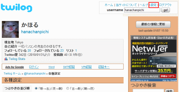 1.Twilogにログインした状態で、画面右上の「設定」をクリックします。
