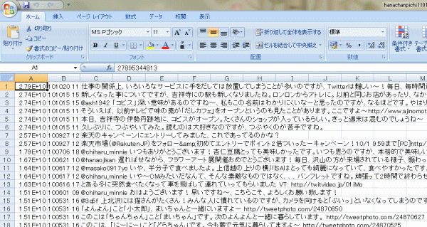 1行に1ツイードといったようになっています。日付と時間は、B列になります。