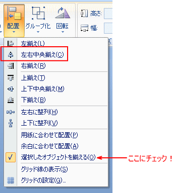 11.「描画ツール」の「配置」グループから、「配置」を「左右中央揃え」にします。