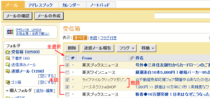 メール一覧の状態で、各メールの先頭にあるチャックボックスをクリックし、チェックを入れます。