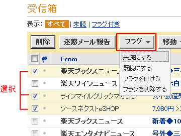 「フラグ」は、選択した(チェックの入った)メールを「未読」「既読」「フラグを付ける」「フラグを削除する」の設定ができます。