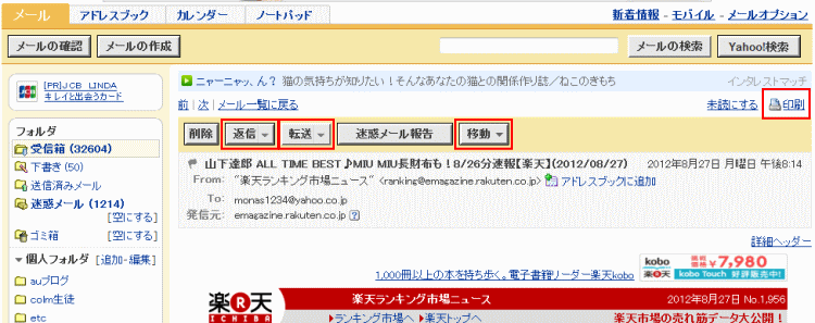 その後、「削除」または「迷惑メール報告」のボタンをクリックすると、それぞれのフォルダに移動されます。