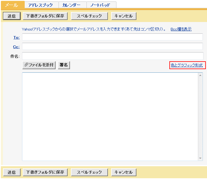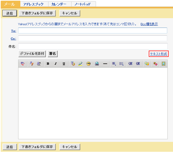 「色とグラフィック形式」と「テキスト形式」の切り替えは簡単で、本文右上にあるボタン「色とグラフィック形式」または「テキスト形式」をクリックするだけです。(下がテキスト形式のメール作成画面↓書式を設定するボタンがありません。)