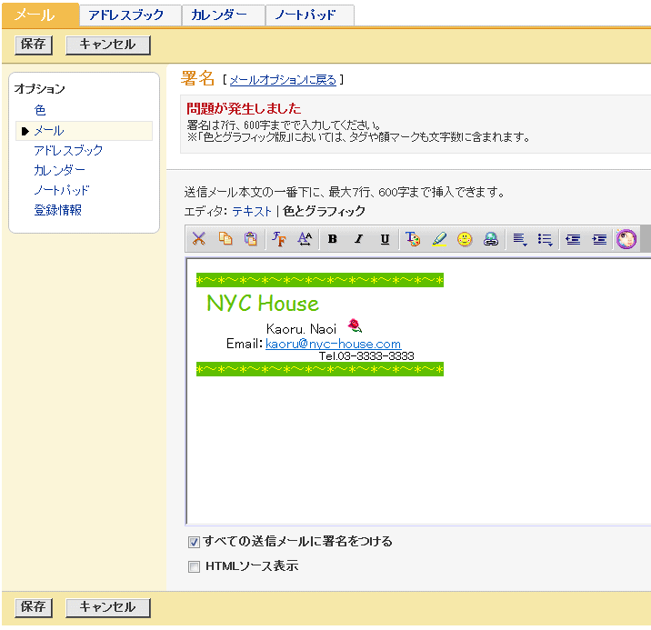 その中の「署名」をクリックすると下のような署名作成画面が表示されます。