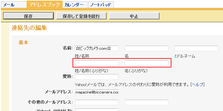 以前、「姓」だけでも・・・とお話したのですが、アドレスブックの登録すすが増えると探すのが大変なので、できれば昇順で並んでほしいという意味で「姓/名称(ふりがな)」も入れてあげて下さい。