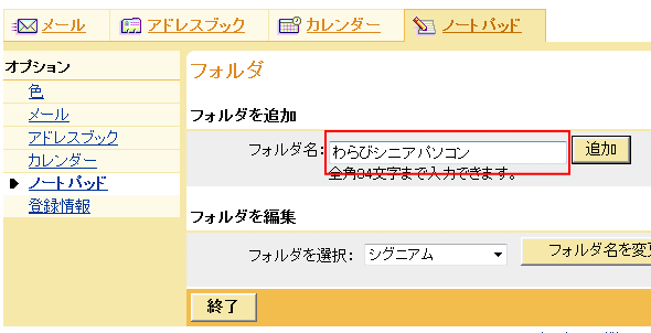 下のような画面が表示されるので、「フォルダ名」を入力し、「追加」ボタンをクリックします。